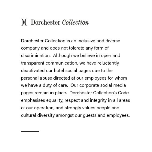 Operating as the Dorchester Collection brand of hotels, the group has pasted notices on its Twitter and Facebook accounts that state, “Dorchester Collection is an inclusive and diverse company and does not tolerate any form of discrimination. Although we believe in open and transparent communication, we have reluctantly deactivated our hotel social pages due to the personal abuse directed at our employees for whom we have a duty of care. Our corporate social media pages remain in place. Dorchester Collection’s Code (emphasizes) equality, respect and integrity in all areas of our operation, and strongly values people and cultural diversity amongst our guests and employees.”