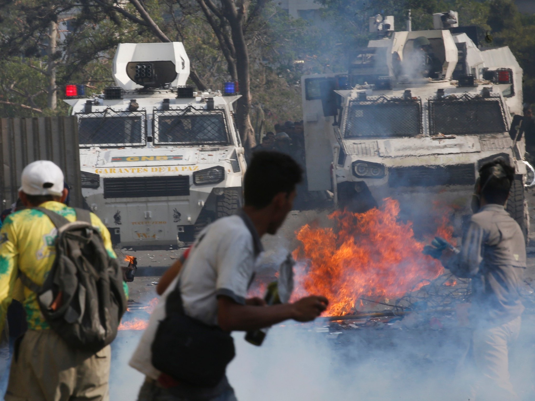 Opponents to Venezuela’s president Nicolas Maduro face off with Bolivarian National Guards in armored vehicles, loyal to the president, during an attempted military uprising in Caracas, Venezuela. Opposition leader Juan Guaido took to the streets with a small contingent of heavily armed troops in a call for the military to rise up and oust Madur