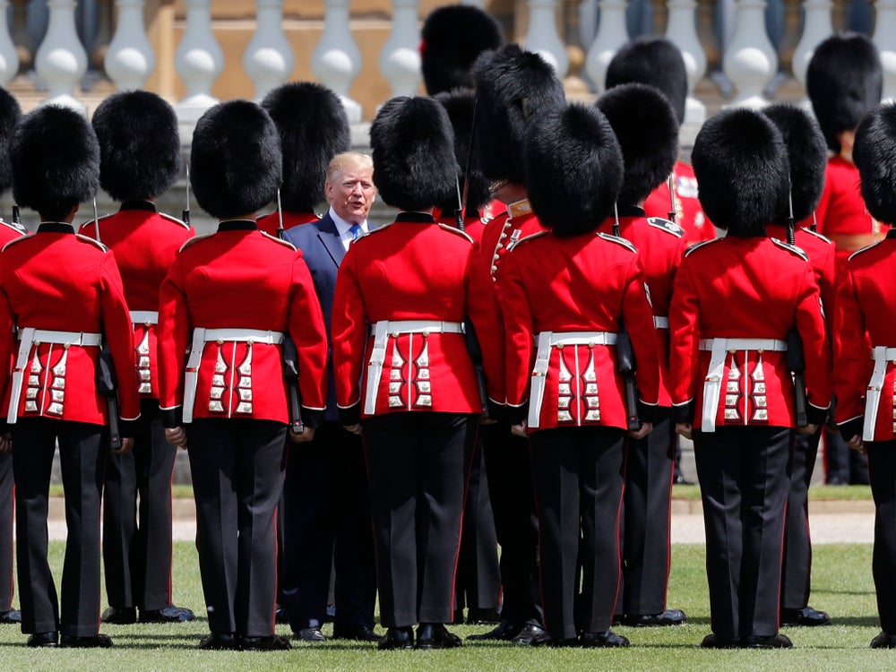 President Donald Trump reviews an honor guard during a ceremonial welcome in the garden of Buckingham Palace in London
