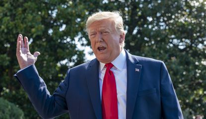 President Donald Trump speaks to members of the press before departing from the White House on the south lawn before he boards Marine One on August 09, 2019 in Washington, DC. Donald Trump spoke to reporters about gun background checks and the escalation of the US-China trade war. (Tasos Katopodis/Getty Images)