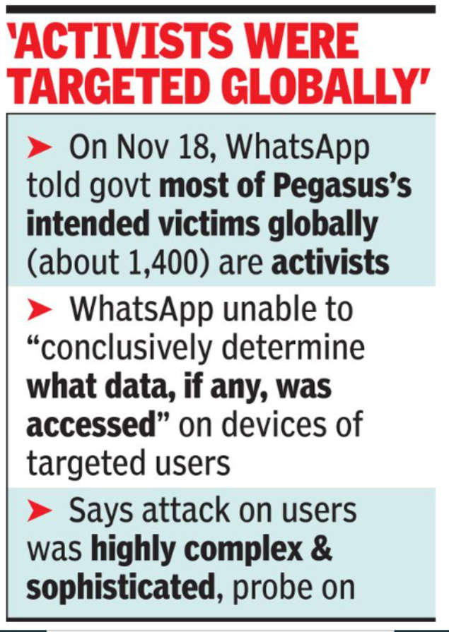 With reports saying activists with an anti-government bent and some journalists were targeted, WhatsApp has indicated that most of Pegasus’s intended victims globally (about 1,400) were also largely activists. The platform said it offered support to “members of civil society globally targeted by the attack”.