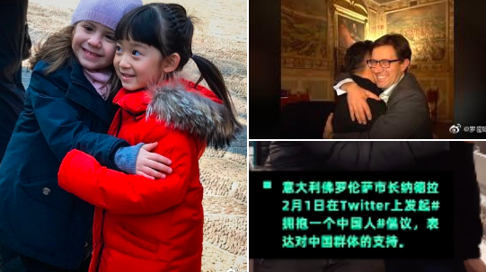 The mayor of Florence, Italy, initiated “hug a Chinese” on Twitter on Feb 1, opposing anger toward Chinese amid the coronavirus outbreak, and calling for “Unity in this common battle!” Many Italian citizens responded by posting photos of themselves with Chinese.