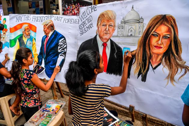 INDRANIL MUKHERJEE via Getty ImagesTOPSHOT – Students paint on canvas faces of US President Donald Trump (C), his wife Melania (R), and India’s Prime Minister Narendra Modi (L) in the street in Mumbai on February 21, 2020, ahead of the visit of US President in India. (Photo by INDRANIL MUKHERJEE / AFP) (Photo by INDRANIL MUKHERJEE/AFP via Getty Images)