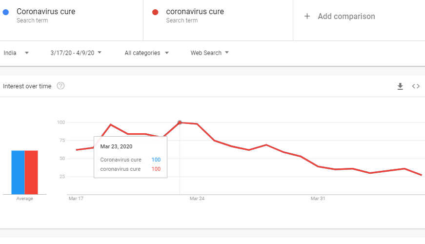 On the other hand, the interest in the search term “coronavirus cure” spiked on 19 March and peaked on 23 March, the day after the “Janta curfew” called by Prime Minister Narendra Modi and the day before the lockdown came into effect.