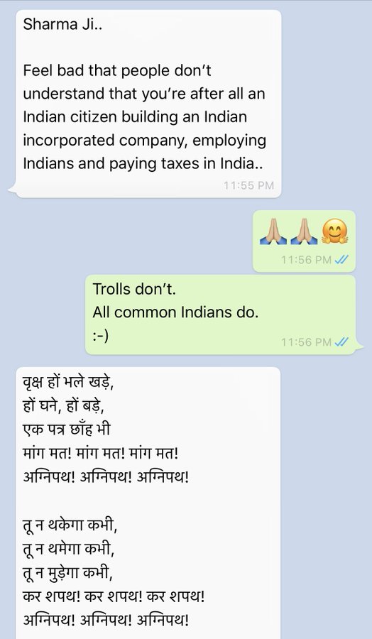 Below is one of the stinging tweets (a purported Whatsapp message) that Sharma tweeted in response to the troll army.
