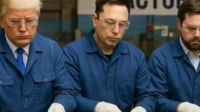 This still from an AI-generated video by Chinese social media users shows three men possibly depicting Donald Trump, Elon Musk and JD Vance making shoes inside a factory. (IMAGE: X)
