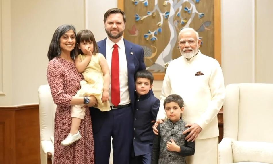 The schedule at Mr Modi’s residence Monday evening seemed to have three components, of which the second was the formal meeting while the third was a dinner hosted by Mr Modi for the Vance family and the accompanying American delegation. The first was an informal chat, with Mr Modi warmly chatting with Mr Vance and his wife Usha in the company of the couple’s three small children — sons Ewan and Vivek and daughter Mirabel. Mr Modi initially received the Vance family warmly at his residence on their arrival. Footage later showed all of them seated in a living room, with Mr Modi interacting affectionately with the three small children as the Vance couple looked on, expressing delight. Mr Modi also gave the children a peacock feather each. The peacock is India’s national bird. The children were fascinated and footage also showed Mirabel swatting her smiling father on the face with the feather. The children were dressed in formal and traditional Indian attire.