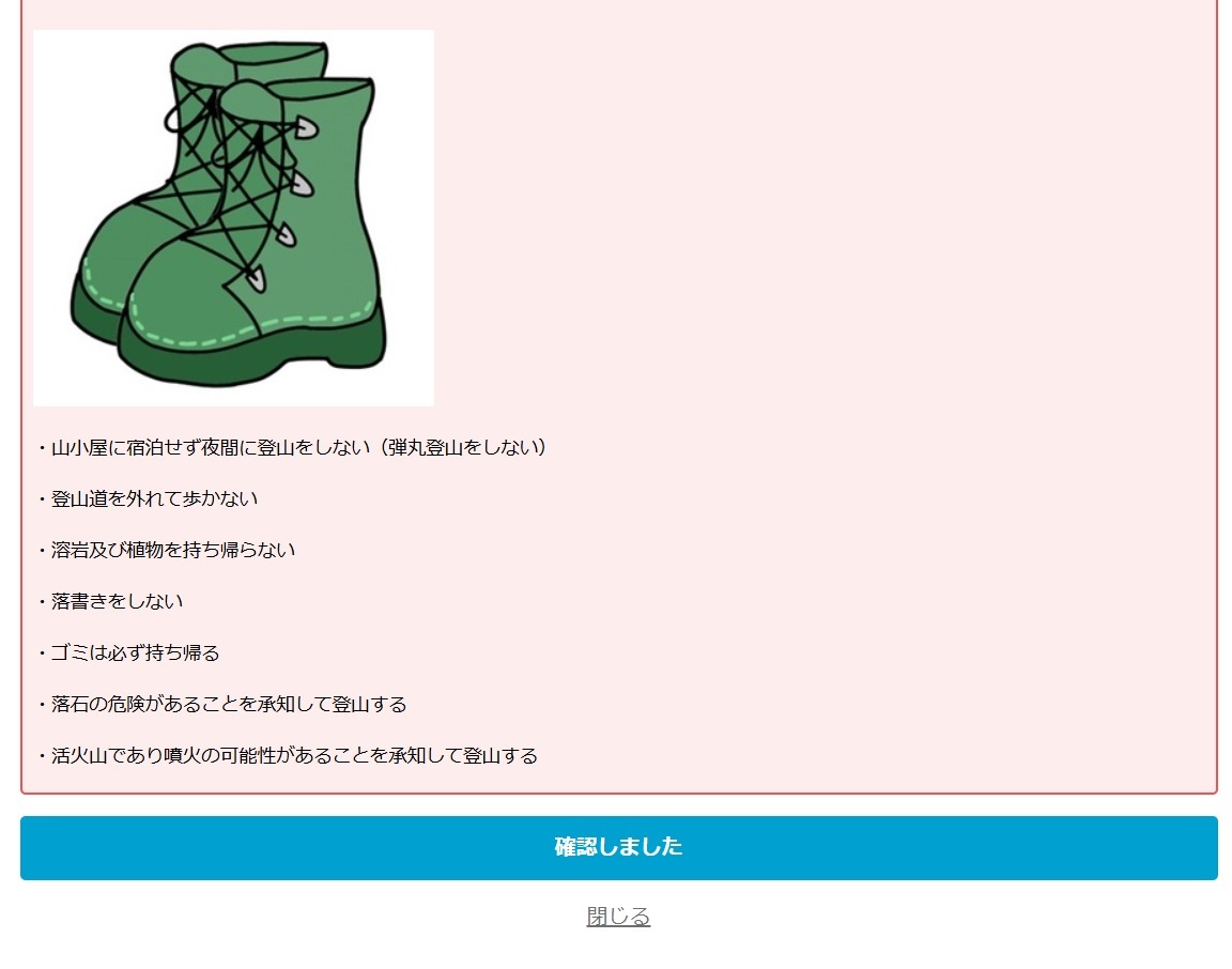This will bring up a list of notices and terms related to climbing, again all in Japanese, explaining that this is for reservations for the Yoshida Trail only, that mountain hut reservations (if required) must be made separately and that there is a limit of 4,000 hikers per day, as well as proverbial fine print related to refunds and rescheduling. At the bottom you’ll need to click on 確認しました (“confirmed”/”understood”) to go to the next screen.