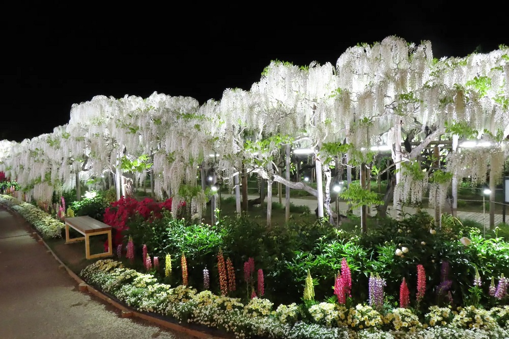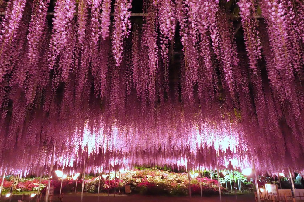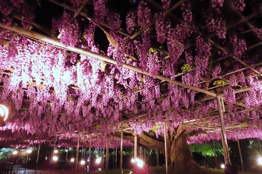 Because of how beautiful Ashikaga Flower Park’s wisteria are, the facility stays open after dark at this time of year, with the contrast between the illuminated blossoms ad the black sky giving them a dramatic atmosphere different from the softer colors of the day.