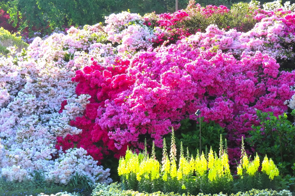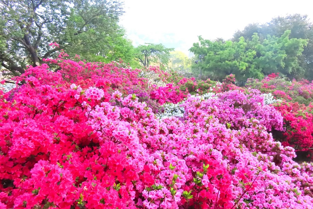 Ah, but we said there are three types of flowers reaching full bloom, right? Next on the list are the azaleas, which we caught a glimpse of behind the Great Wisteria in that earlier photo…