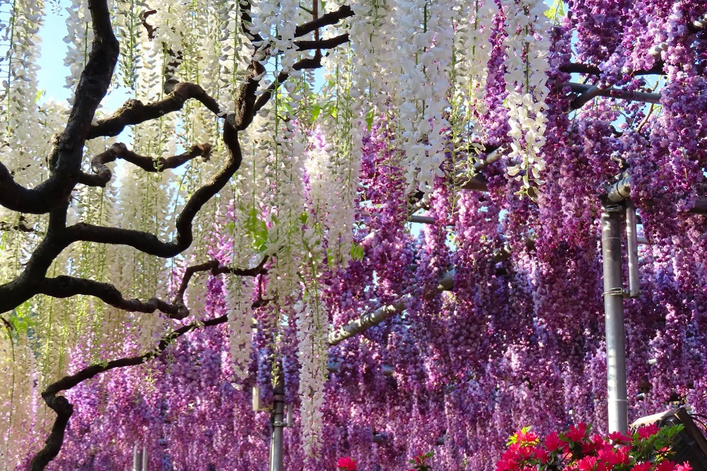 That’s the situation right now at Ashikaga Flower Park in the town of Ashikaga, Tochigi Prefecture. The most dramatic of the in-bloom floral trio are the wisteria, or fuji, as they’re called in Japanese. The park has more than 350 wisteria trees, but if you’re wondering how many of them are needed to create the breathtaking canopy seen in the photos above and below, it’s only one.