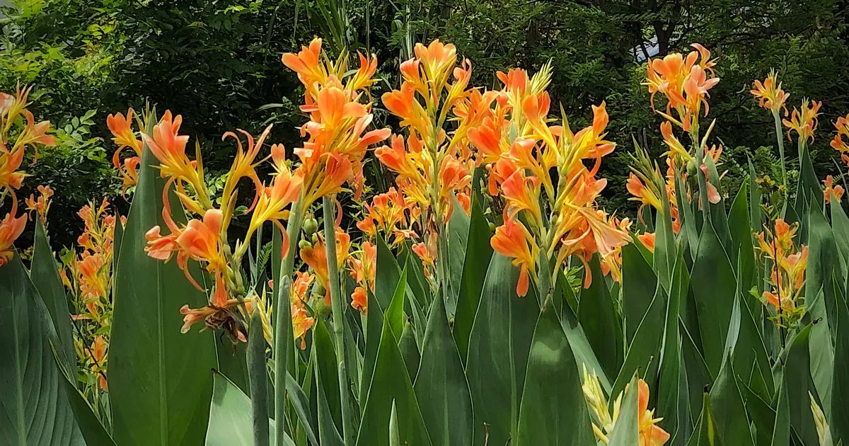 The RHS extols the virtues of canna lilies, describing them as “vibrant tender perennials that produce bold leaves and showy flowers in shades of red, orange, yellows and pinks.”