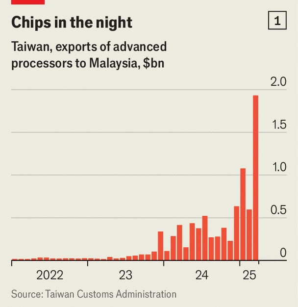 Figures on trade flows support this. Nvidia’s high-end chips are produced by TSMC, the world’s biggest chipmaker, in its Taiwanese factories. In the first quarter of this year Taiwan exported $3.6bn-worth of graphics-processing units—the kind used to train AI models—to Malaysia, nearly matching the total for all of 2024 (see chart 1). In March alone shipments more than tripled from the previous month to reach almost $2bn.