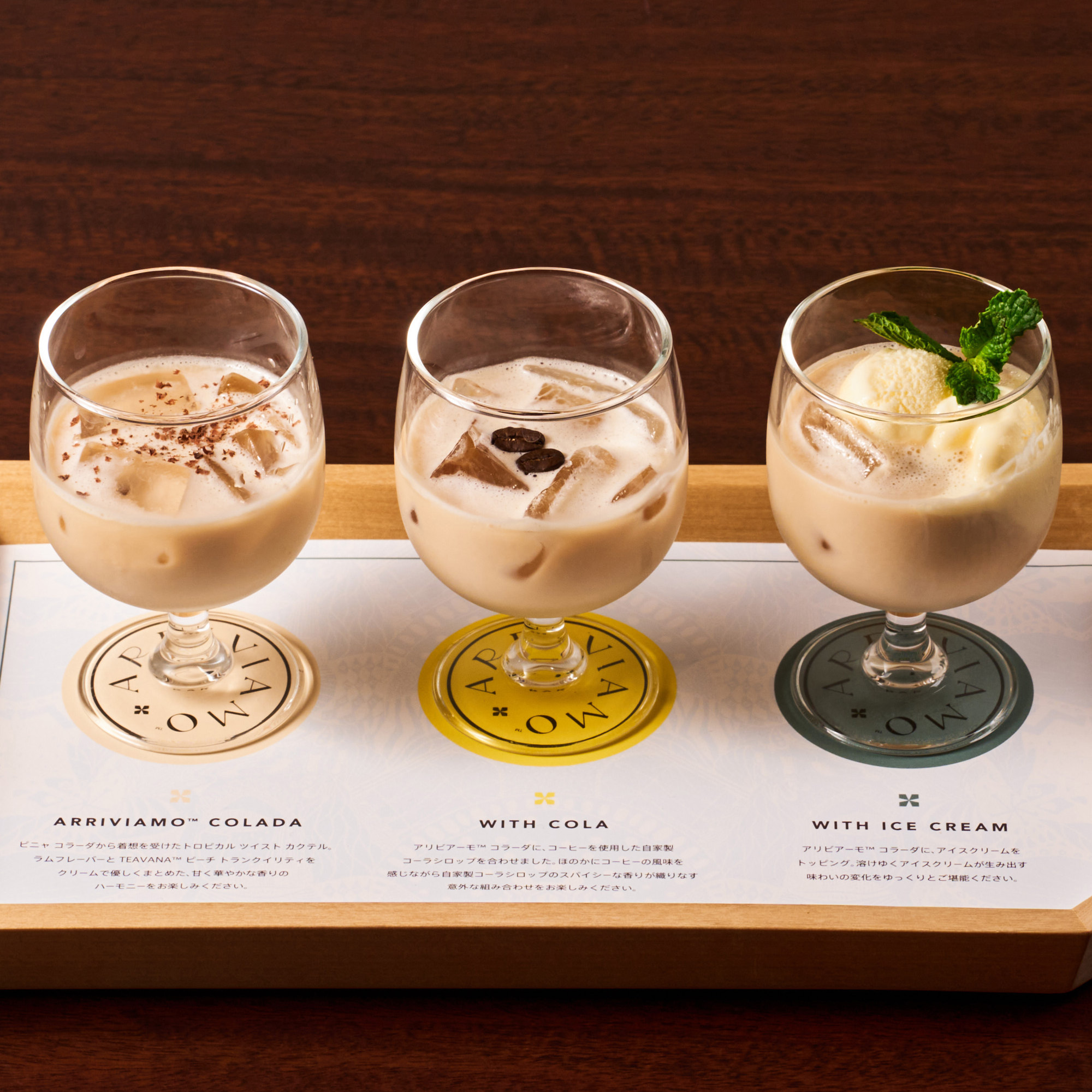 Up at the third-floor Arriviamo Bar, you can enjoy a flight of three Piña Colada-inspired beverages. These cocktails blend rum, milk and cream with “Teavana Peach Tranquility”, a tea known for its gentle peach flavor and chamomile aroma. Alongside the regular cocktail, you can sample two others: one featuring house-made cold brew cola syrup and another with vanilla ice cream.