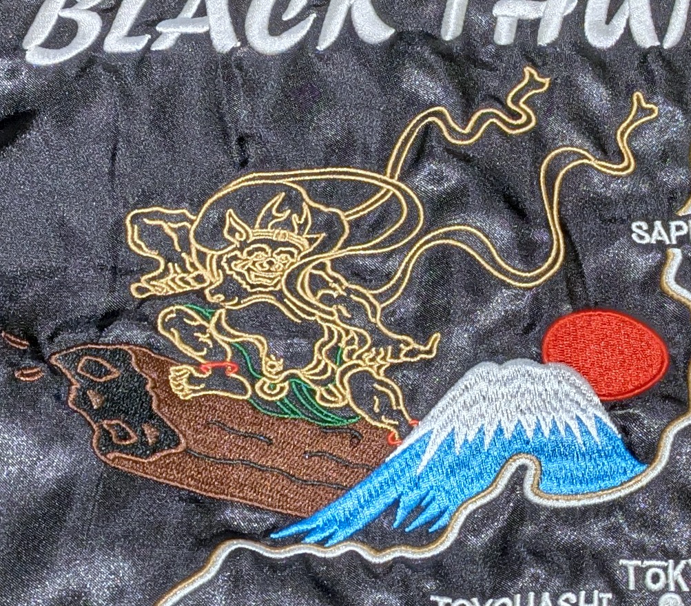 Adding the little Japanese flairs of a hawk and Mt. Fuji is a nice touch, but the pièce de résistance is the design of a thunder god, which would traditionally be riding a cloud, but is instead riding a Black Thunder. Mr. Sato was in love with the quirkiness of the embroidery.
