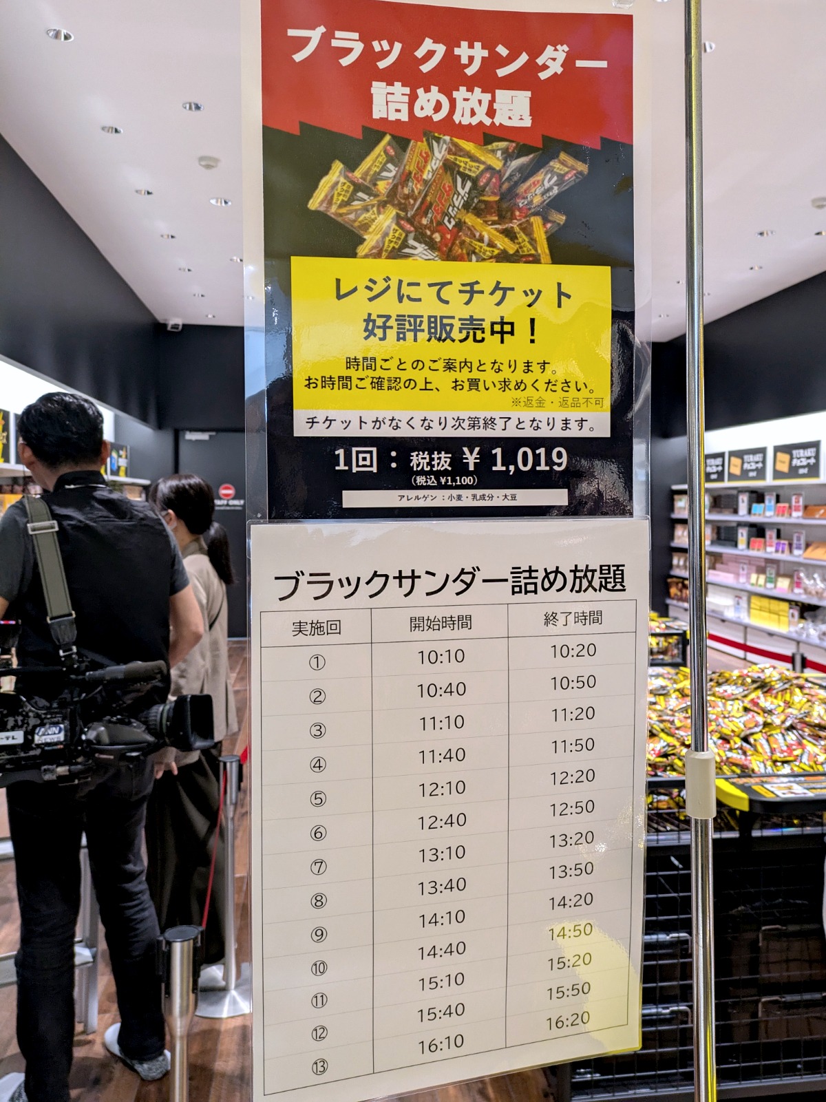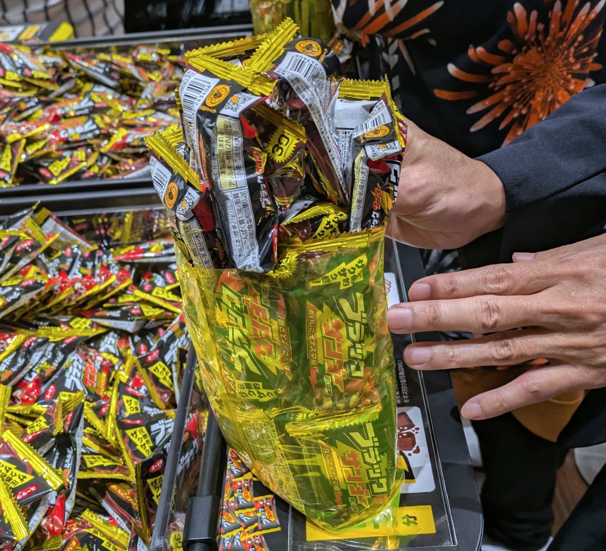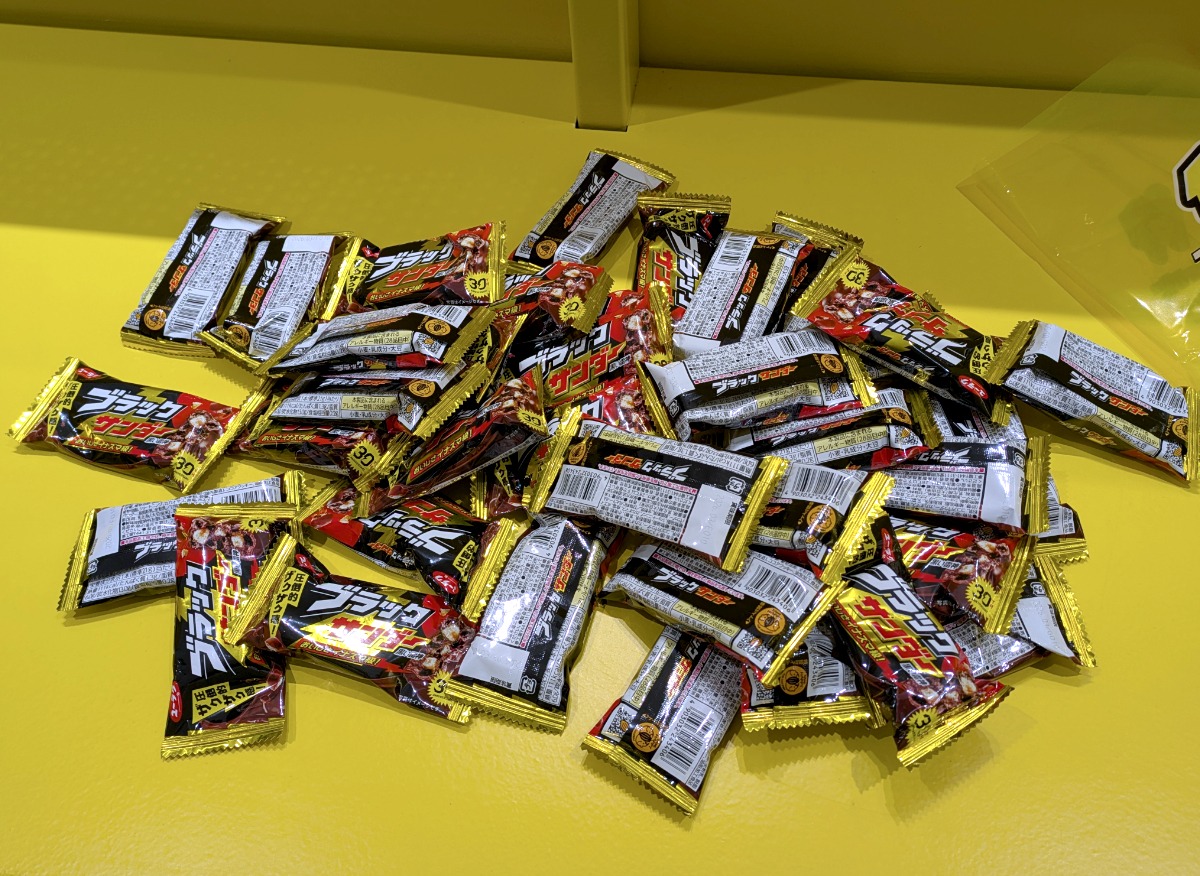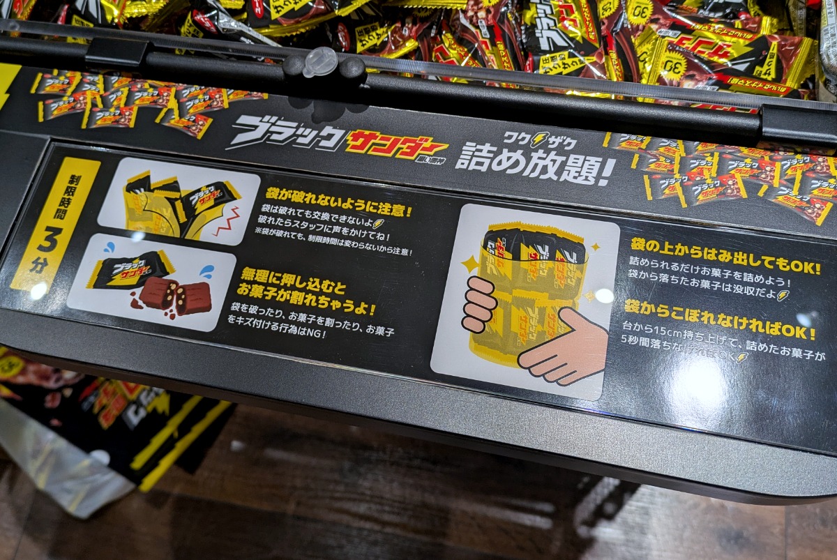 The rules are simple: within three minutes, you need to put as many Black Thunders as you can into the designated bag. You can overfill as long as you can lift it and hold it steady for five seconds without anything falling. If you can manage that, you get to keep it all.