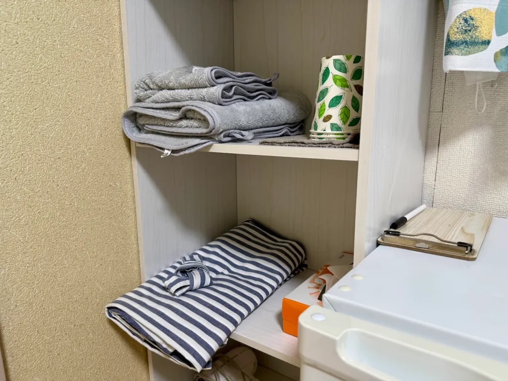 On the shelves were neatly folded towels and a yukata bathrobe, and next to them was the door for the bathroom.