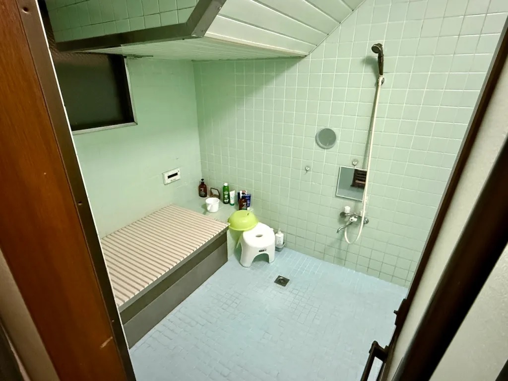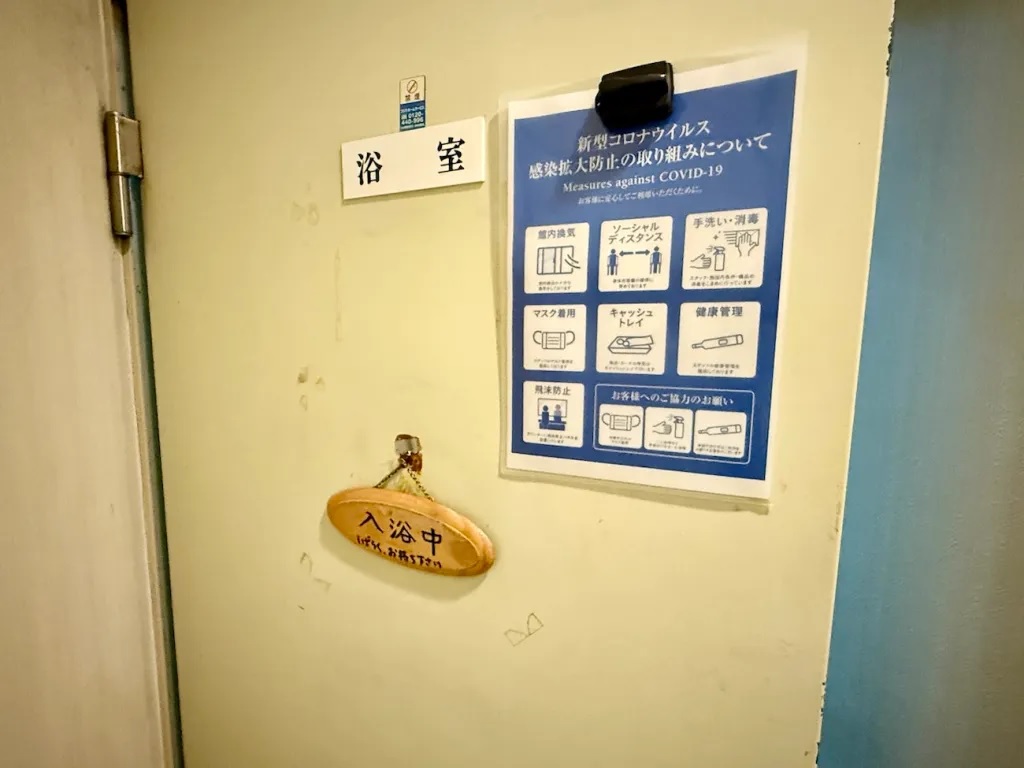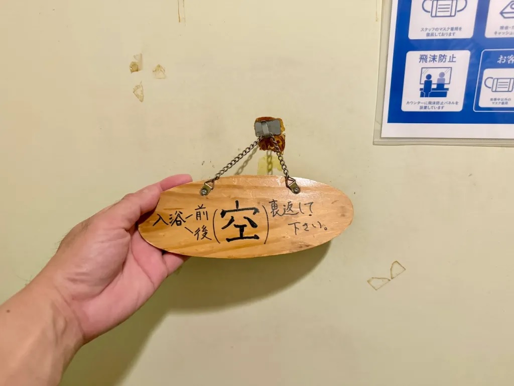 Hanging on the bath area door is a wooden placard, which you flip from “available” (空) to “in use” (入浴中) before you go in.