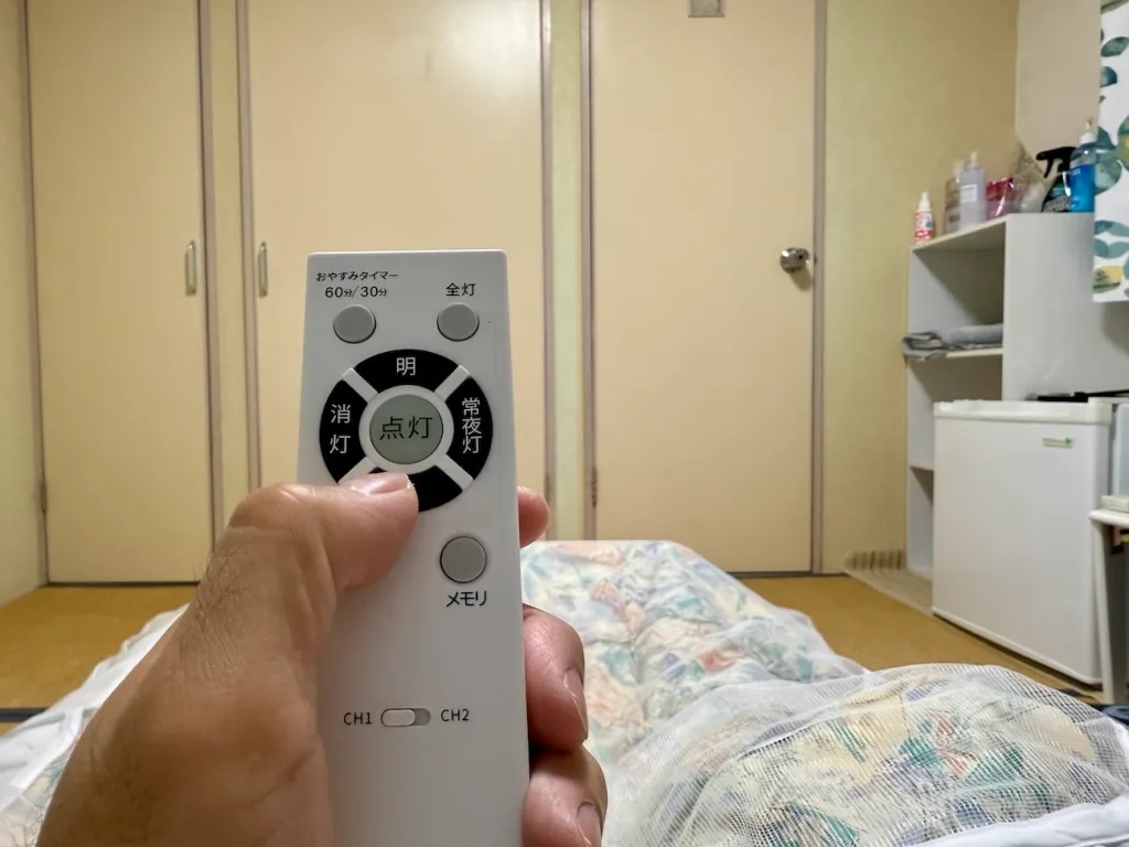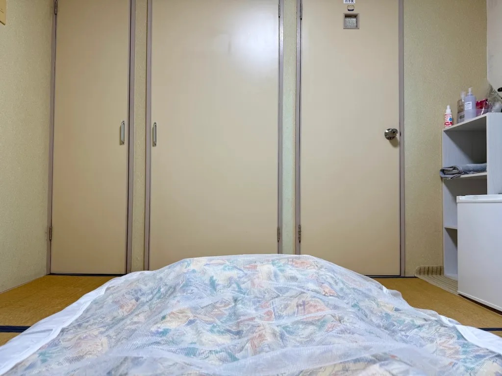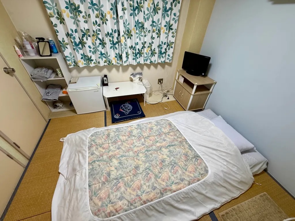 Laid out on the tatami reed flooring was a futon, and beyond it were shelves, a desk, a zabuton cushion to sit on, and a compact fridge and TV.