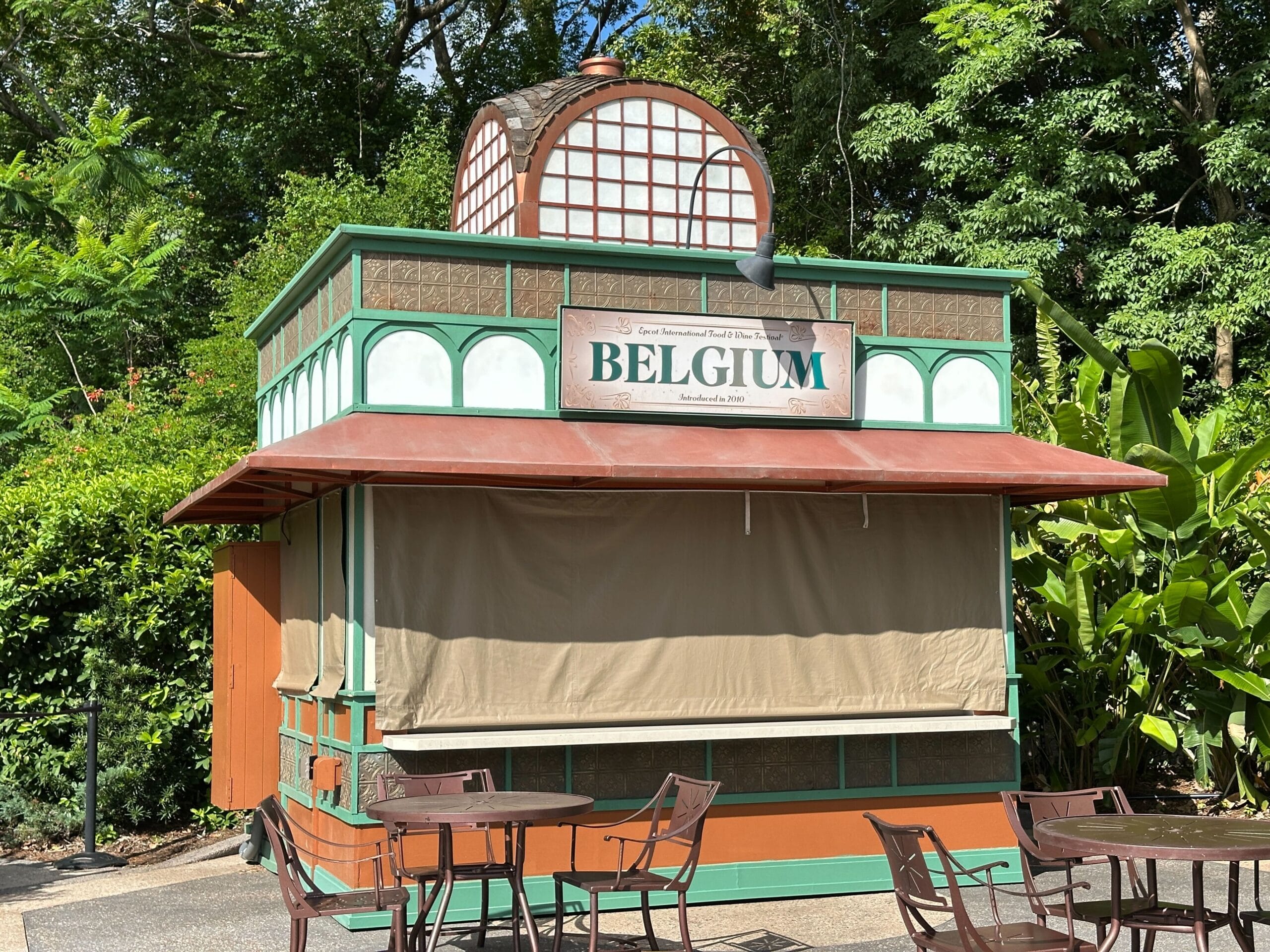 The Belgium, Greece, Alps, and India food booths — or Global Marketplaces — all have signs. The signs include the festival name, the marketplace name, and the year the marketplace debuted at the festival. Usually, the signs would have banners indicating the booths are “Coming Soon,” but these don’t currently.