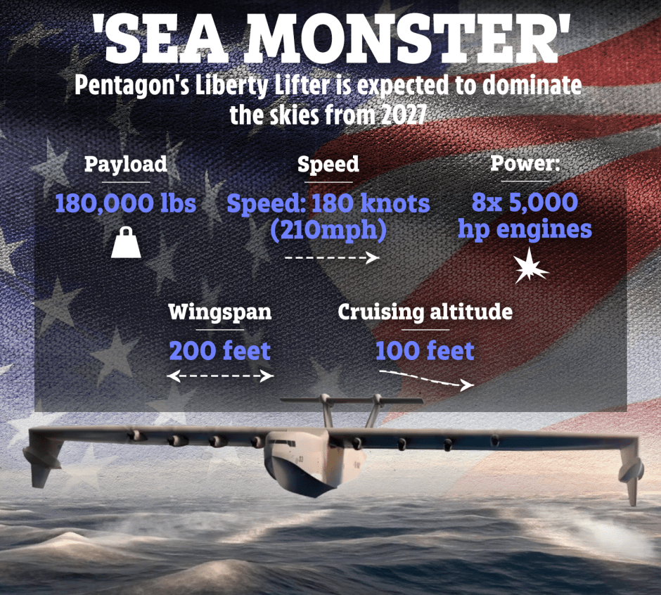Illustration of the Pentagon's Liberty Lifter, showcasing its specifications: payload, speed, power, wingspan, and cruising altitude.