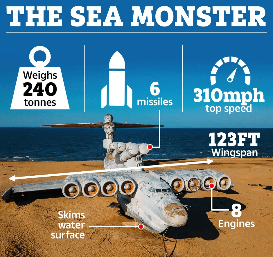 Caspian Sea Monster, a 302ft Soviet Sea Monster, was a prime example of an ekranoplan.