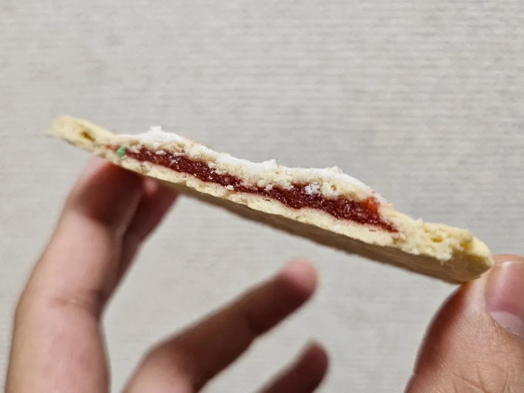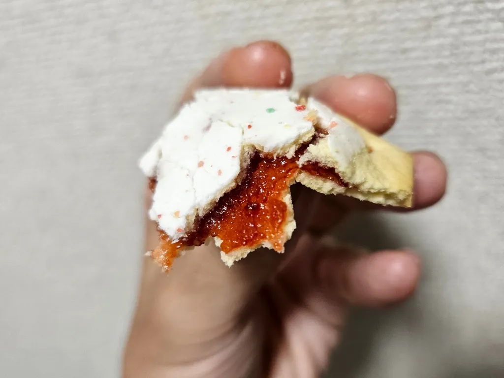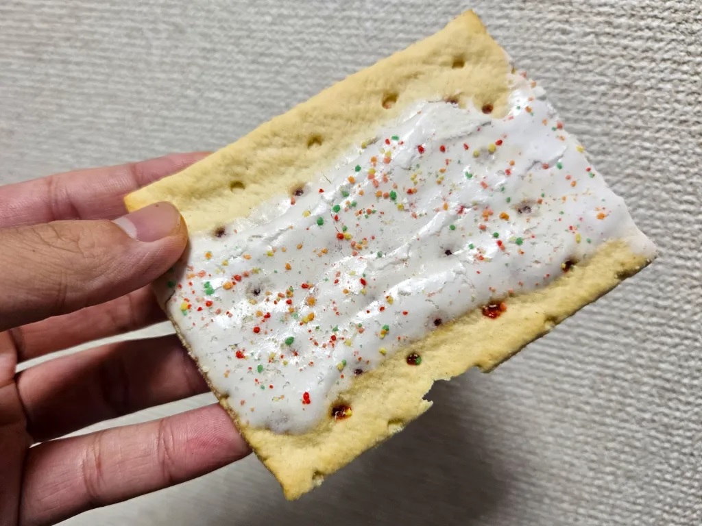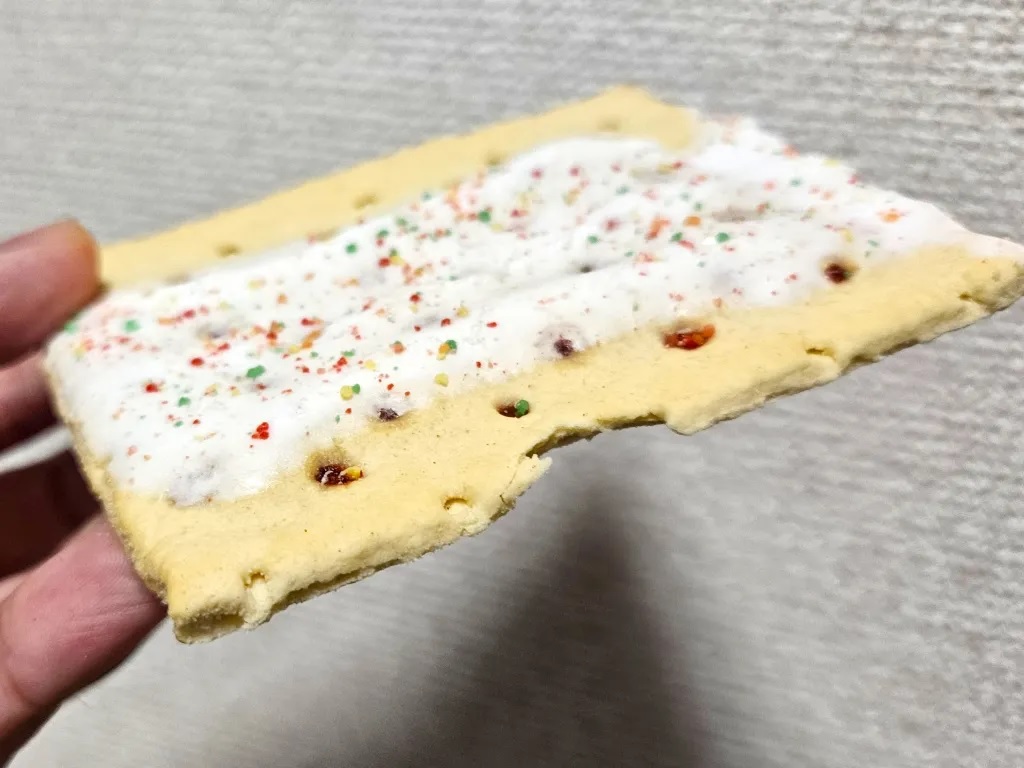 The reviews from Japanese customers on Amazon had described Pop-Tarts’ flavor as crazy sweet, but Takuya actually found it rather enjoyable. He wouldn’t describe the taste as refined or balanced, but it wasn’t as intensely sugary as he’d been bracing himself for. As a matter of fact, Takuya was startled by how unsweet the dough was in sections where it wasn’t touched by sugar, frosting, or jam. Without any extra sweeteners, the flavor of the dough most reminded Takuya (who’s a big burrito fan) of a tortilla.