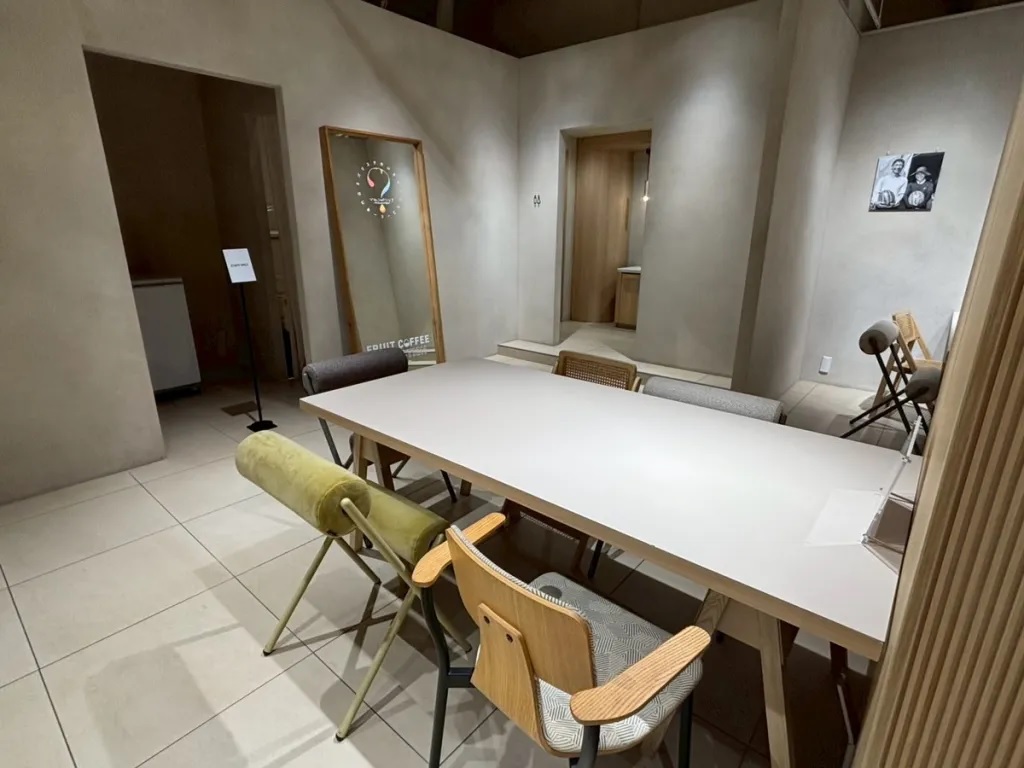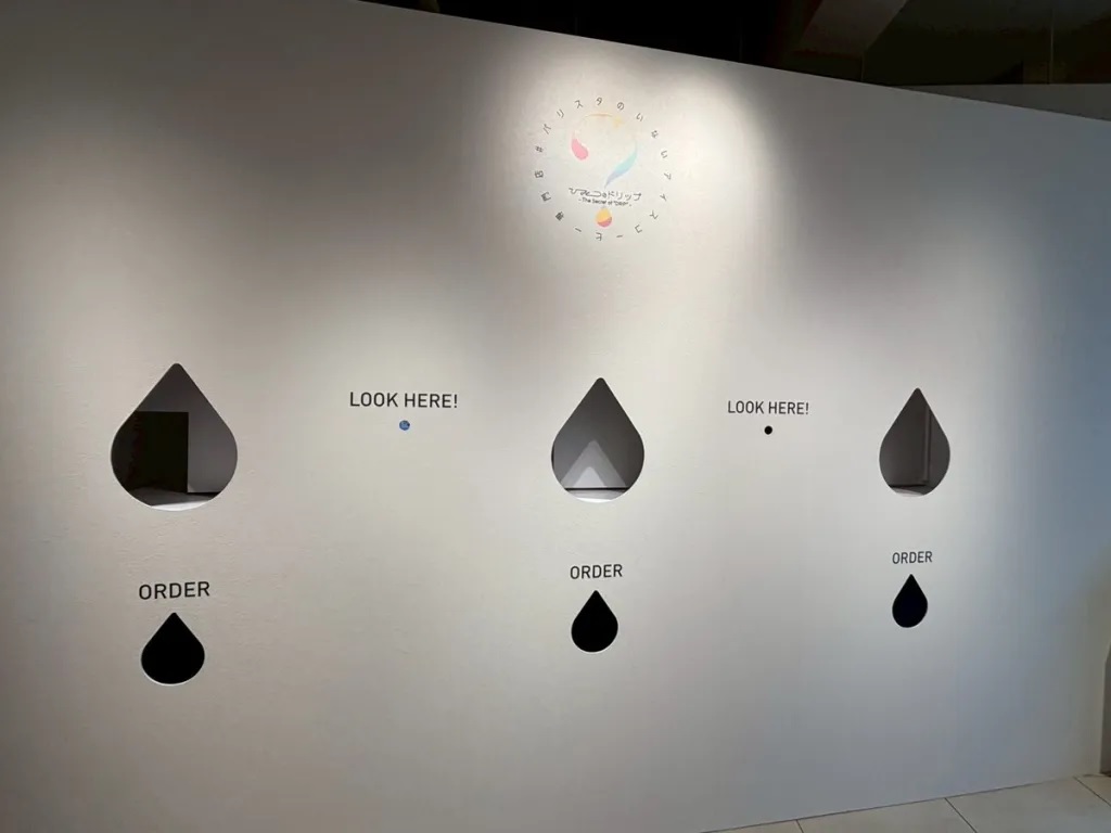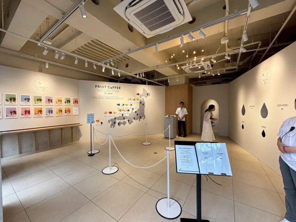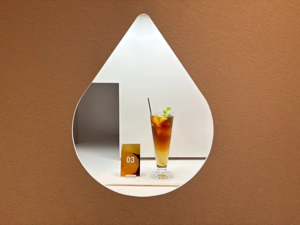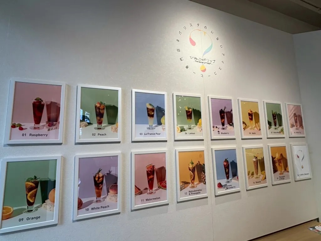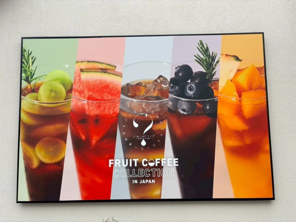 The cafe’s name translates to “Secret Drip,” and it definitely has a mysterious-looking interior. Stepping inside, we were greeted by photos of the drink lineup and a map of Japan showing where the produce is sourced for the cafe’s selection of fruit coffees. However, we saw only a single staff member, who takes orders and payments, but not a single waiter, waitress, or barista.