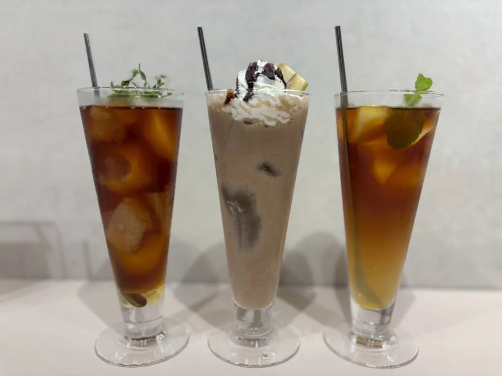 Himitsu no Drip, which is a limited-time cafe run by Japanese coffee company UCC, is as particular about the presentation of its drinks as it is the shop’s interior. Everything we’d ordered came beautifully arranged in tall glasses, looking like something that you’d ordinarily pay at least three times as much as Himitsu no Drip charges for a swanky Harajuku cafe drink.