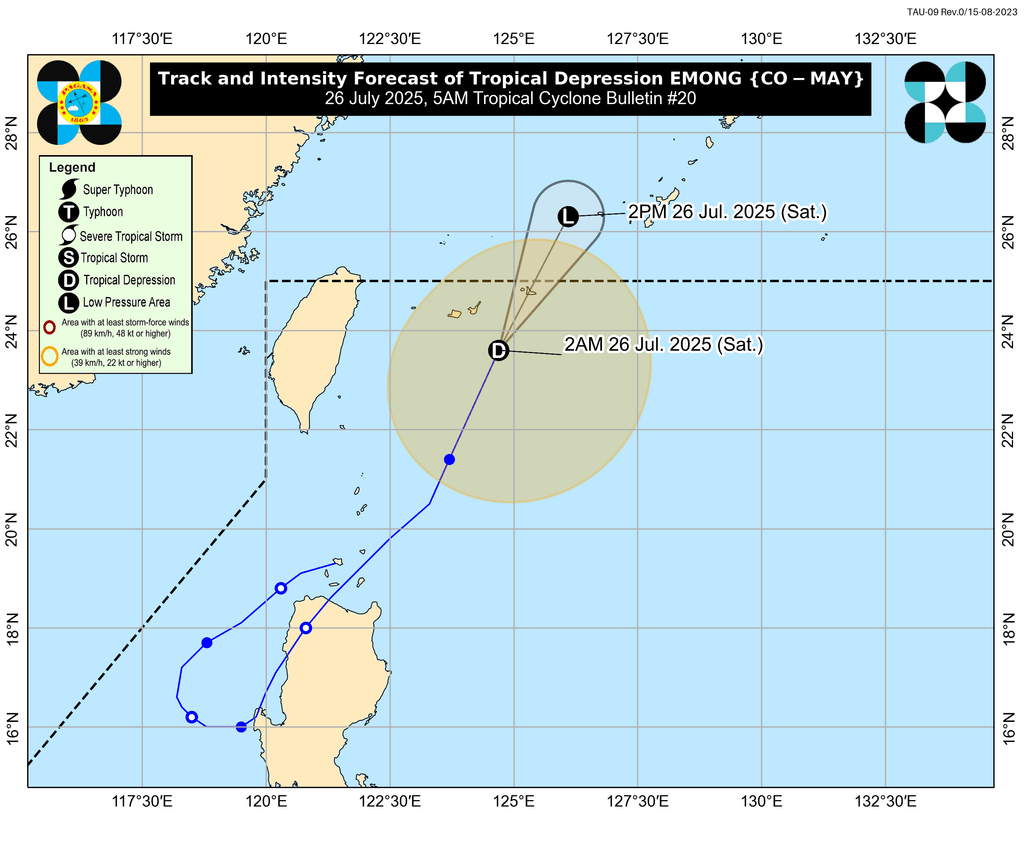 MANILA, Philippines – Emong (Co-may) weakened further from a tropical storm into a tropical depression as of 2 am on Saturday, July 26, then left the Philippine Area of Responsibility (PAR) at 7:10 am.