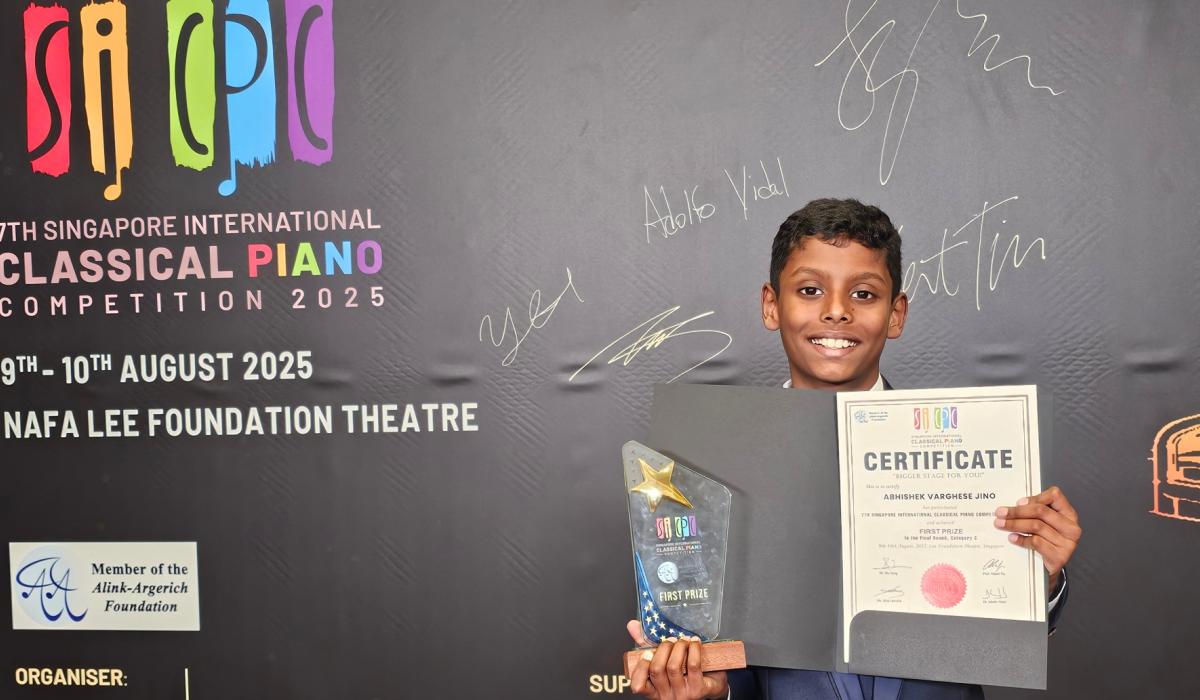 Ten-year-old Abhishek Jino from Newcastle West has won first prize in category C at the 2025 Singapore International Piano Competition.