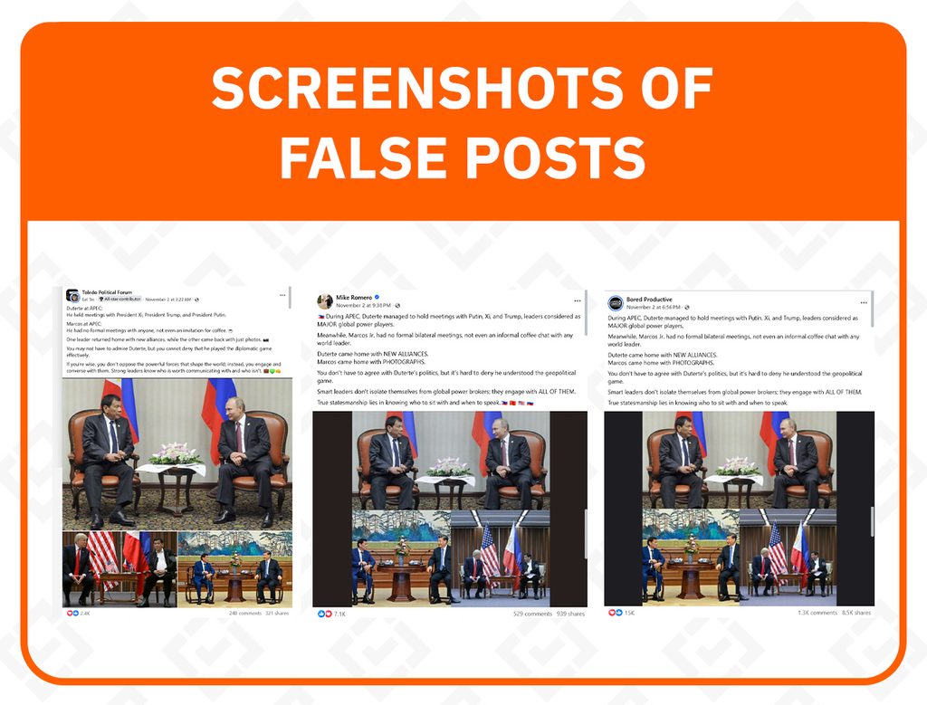 Additionally, the collage photo in the post misleads viewers into thinking that Duterte met with Putin, Xi, and Trump at an APEC summit — which is not true. Duterte only had formal APEC bilaterals with Putin in 2016, but his meeting with Xi that same year was a state visit, and the Trump meeting happened in 2017 during the Manila ASEAN Summit. Nonetheless, he had bilaterals with all of them. – Leah Sagaad/Rappler.com