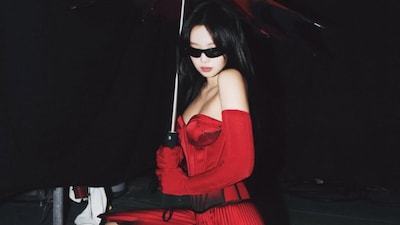 The K-pop icon was seen donning a striking red corset, which she paired with an asymmetrical mini skirt. She completed the look with red gloves, an oversized black leather jacket, and matching knee-high boots. Her striking, bold appearance marked a departure from her signature ‘Human Chanel’ look, proving her charismatic presence.