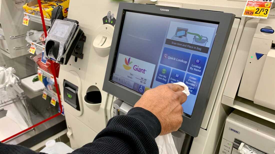A man purchases groceries at a self check-out at a supermarket in Washington, DC.