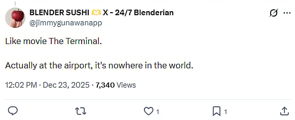 As the post gained traction, social media users drew comparisons with The Terminal, which was inspired by the real-life story of Mehran Karimi Nasseri, an Iranian refugee who lived at Paris’s Charles de Gaulle Airport from 1988 to 2006 due to legal statelessness.