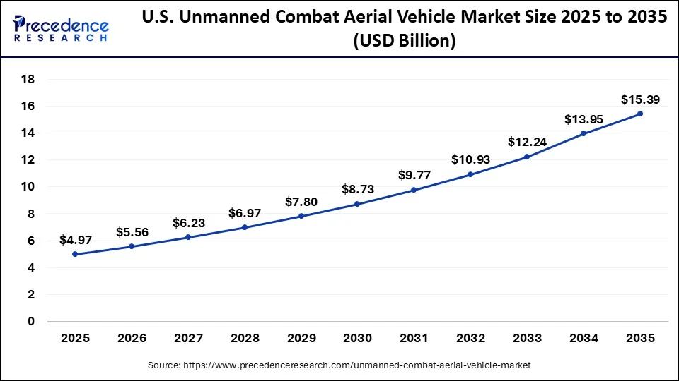 The U.S. unmanned combat aerial vehicle market size accounted for USD 5.56 billion in 20256 and is expected to be worth USD 15.39 billion by 2035, with a solid CAGR of 11.97% from 2026 to 2035.