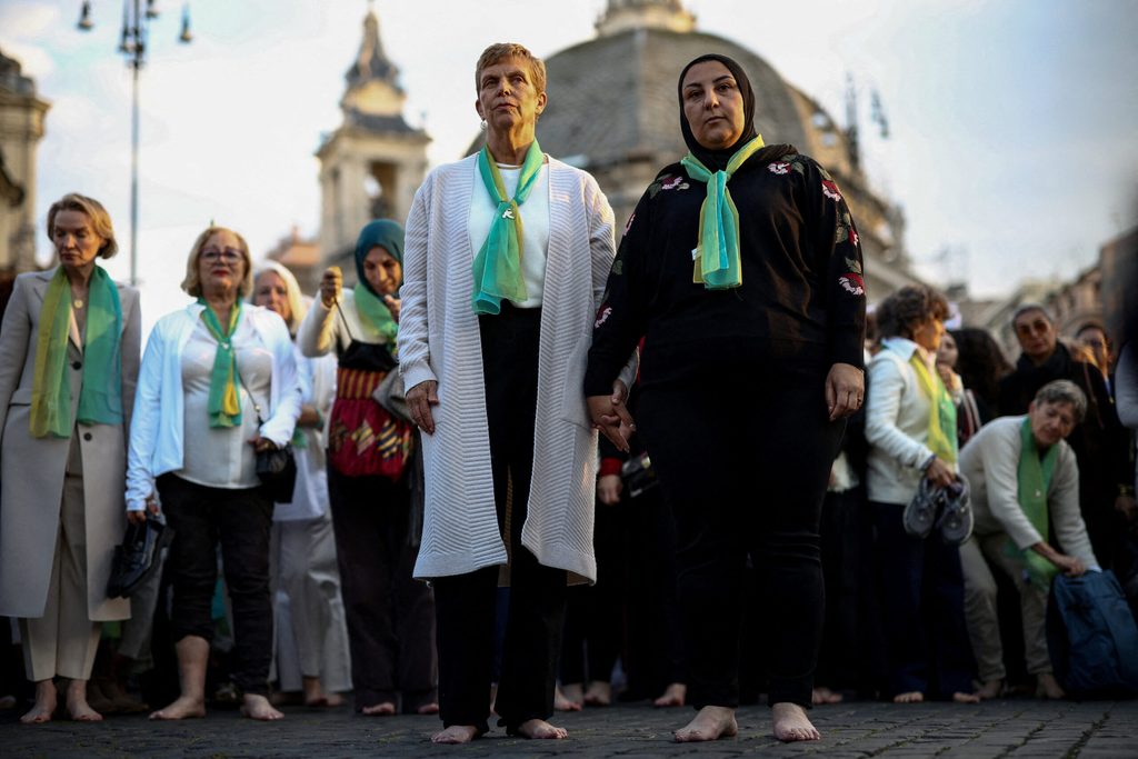 Yael Admi and Reem Al-Hajajreh hold hands as they take part in the ‘Barefoot walk: Mothers’ call for peace’ demonstration in Rome, Italy, on March 24, 2026. PHOTO BY GUGLIELMO MANGIAPANE/REUTERS