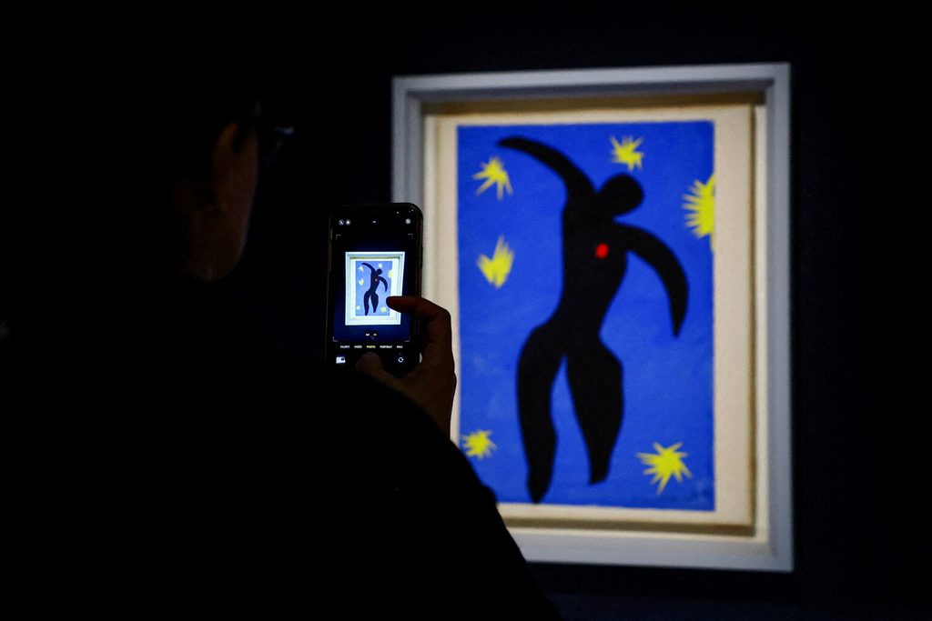 A woman takes a picture of the painting ‘Icare, 1943’ (Icarus, 1943) by painter Henri Matisse during a press visit of the exhibition ‘Matisse, 1941-1954’ at the Grand Palais in Paris, France, on March 23, 2026. PHOTO BY SARAH MEYSSONIER/REUTERS