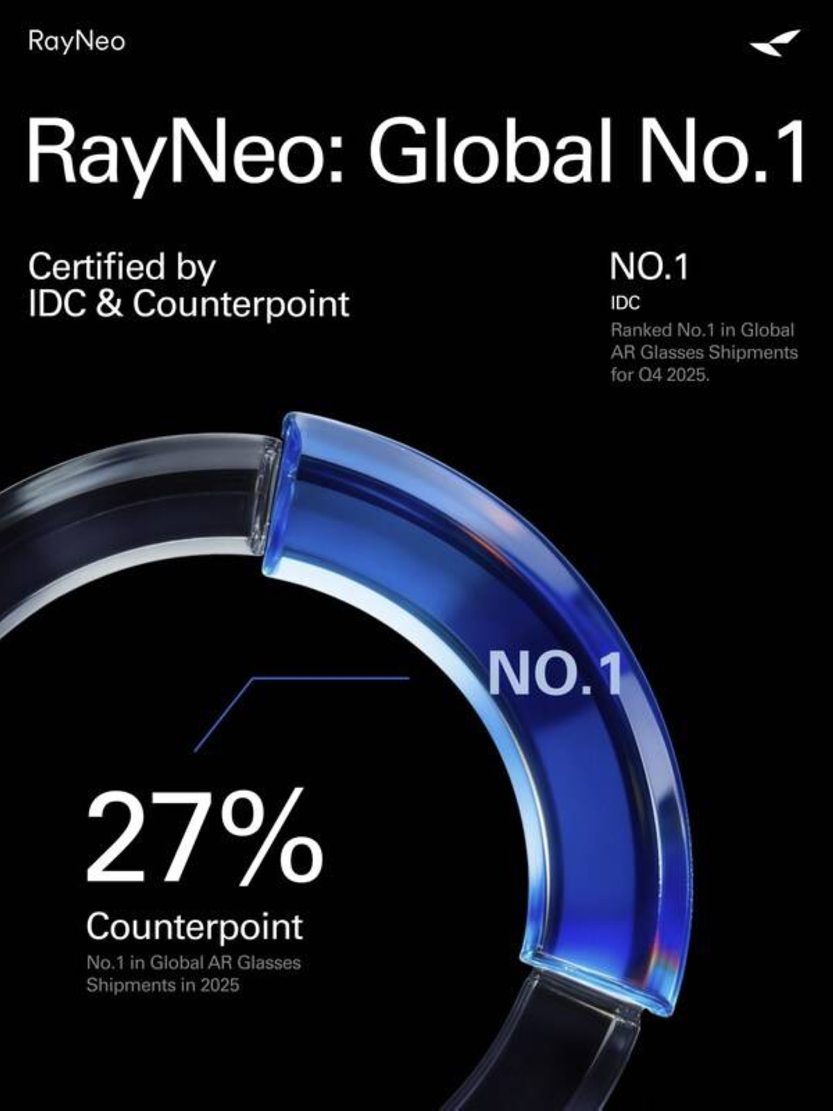 RayNeo is the global leader in consumer Augmented Reality (AR) glasses, dedicated to transforming everyday life for one billion people. As the Official Worldwide Olympic Partner in the AR glasses category, the company represents the forefront of immersive technology. Its product portfolio features the AI-enhanced, full-color display X Series and the portable, large-screen Air Series, designed for versatility and high-quality viewing. According to Counterpoint Research, RayNeo dominated the global AR glasses market in Q3 2025, capturing a 24% market share and securing the top position worldwide.