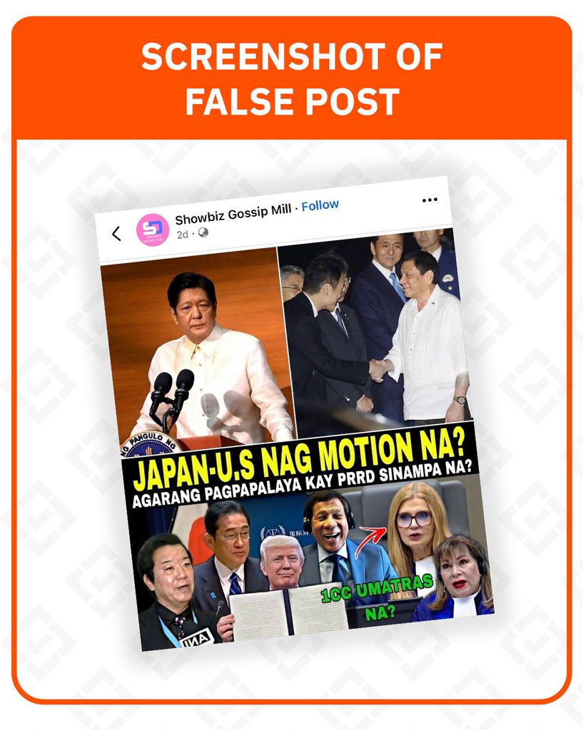 Claim: Japan and the United States (US) have formally filed a motion before an international body seeking the release of former president Rodrigo Duterte, who is detained at the International Criminal Court (ICC).