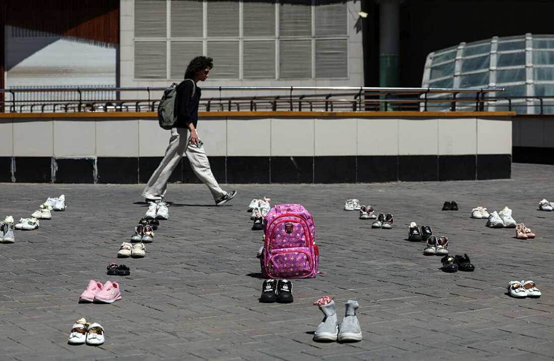 An Iranian woman walks past symbolic belongings laid on the ground at Valiasr Square in Tehran on April 24, 2026, in tribute to the schoolgirls in Minab killed in an airstrike.